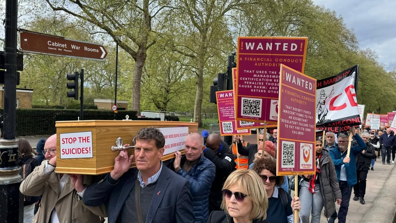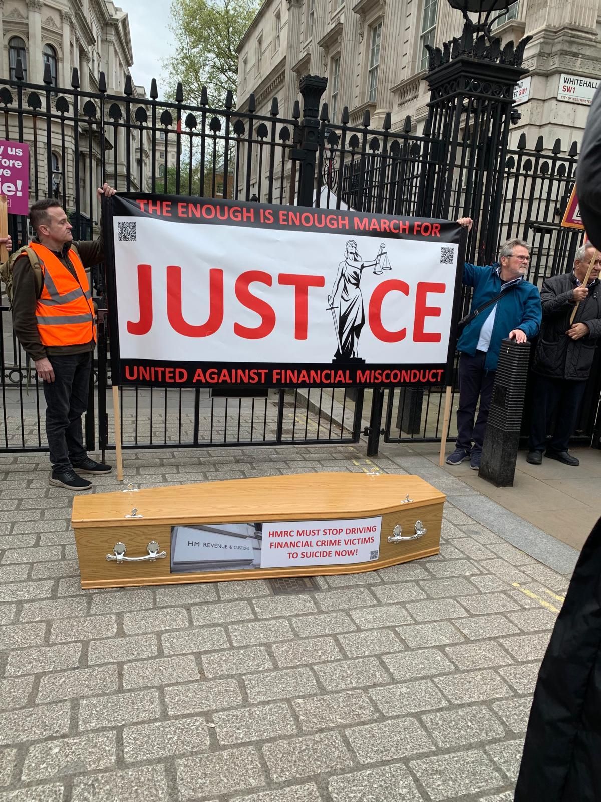 The "Enough is Enough March for Justice" (https://www.theenoughisenoughmarchforjustice.org ) brought together key workers, pensioners, prominent individuals, MPs, and former Premiership footballers such as Andy Cole, Danny Murphy and Craig Short, all rallying for accountability and reform. This took place on the afternoon of April 17, 2024. The march commenced at 2:15 pm from the Royal Courts of Justice, led by former Premiership footballers alongside coffin bearers symbolising the many lives lost and at risk because of financial misconduct. The march - led by Sue Flood and Carly Barnes-Short - took place in response to an urgent call to action from Andy Agathangelou. Survivors of fraud stood up publicly, demanding justice and systemic reform in one powerful voice.
